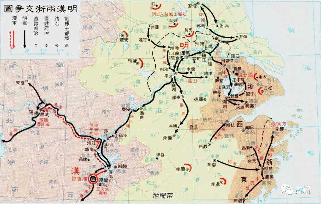 诸葛亮初出茅庐,为刘备作了三分天下的划策,而后的事变进展若合符节。刘基初见朱元璋,陈时务十八策,并为元璋制定东西两个战略方向上的攻取次第和主攻方向,事变的进展同样是丝丝入扣。刘基的这个献策实在与诸葛亮的隆中对策有异曲同工之妙:“明公因天下之乱,崛起草莽间,尺土一民无所凭借,名号甚光明,行事甚顺应,此王师也。我有两敌:陈友谅居西,张士诚居东。友谅包饶、信,跨荆、襄,几天下半;而士诚仅有海边地,南不过会稽,北不过淮阳,首鼠窜扰,阴欲背元,阳欲附之,此守虏耳,无能为也。友谅劫君而胁其下,下皆乖怨。性剽悍轻死,不难以其国尝人之锋,然实数战民疲。下乖则不欢,民疲则不附,故汉易取也。夫攫兽之先猛,擒贼之先强。今日之计,莫若先伐汉。汉地广大,得汉,天下之形成矣”[(7)]。这个议论,对元璋可以说是如雷贯耳。因为在渡江以来,他的眼睛一直在盯着东部的张士诚。他为在与陈友谅之间仍有着元朝地盘的缓冲而心安理得,实际上他与他的部下都担心陈友谅率师东下。在东西两个战略方向上,元璋一直处在一种昏噩模糊状态。他的所有幕僚和顾问都不曾透此一关。现在刘基拨云开雾,指出了夺取天下的必由之路,真如柳暗花明,渐入佳境,有说不出的豁亮和痛快。关于这个决策的重大意义,元璋后来曾有一个解说,谓:“尝与二寇相持。人有劝朕先击士诚,以为士诚切近,友谅稍远。若先击友谅,则士诚必乘我后,此亦一计。然不知友谅剽而轻,士诚狡而懦。友谅之志骄,士诚之器小。志骄则好生事,器小则无远虑,故友谅有鄱阳之役,与战宜速。吾知士诚不能逾姑苏一步以为之援也。向若先攻士诚,则姑苏之城并力坚守,友谅必空国而来,我将撤姑苏之师以御之,是我疲于应敌,事有难为。朕之所以取二寇者,固自有先后也。”[(8)]这段话对当时决策的英明和事后应验讲的十分透辟,唯一的缺点就是掠人之美以为己美。用事后的清醒遮盖了当时的糊涂。