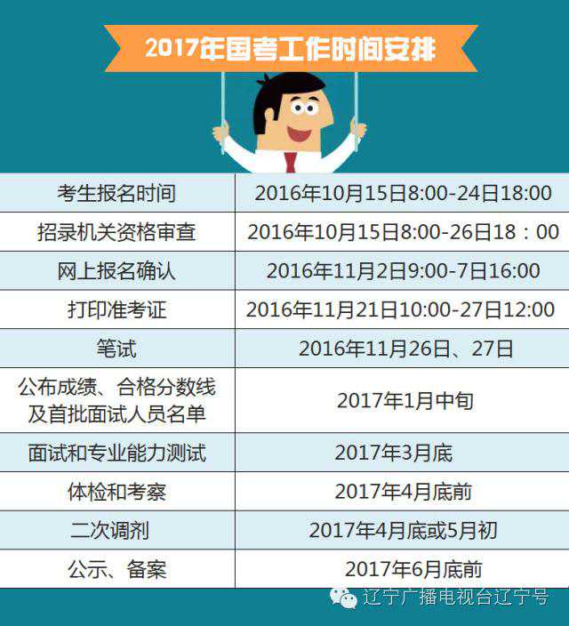 近日,国家公务员局公布了本次国考从报名、笔试到面试、调剂、公示的时间表,全部程序将在2017年6月底前完成。