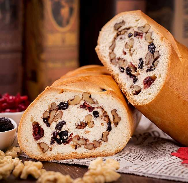 新疆大列巴,用最好的牧场的纯牛奶和面粉,不加一滴水,经过三道发酵工序,加上啤酒花,用特制的椴木烘烤,表皮松脆坚硬,心柔软,最后,加上阿克苏核桃,吐鲁番葡萄干和黑蜂蜜。