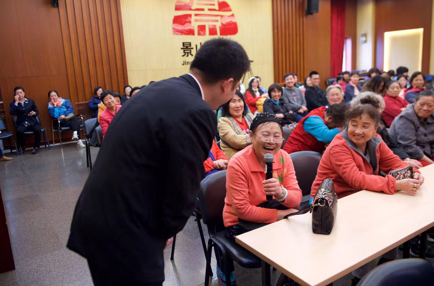 “你看今天这台下人山人海,这么多大爷大妈,今天肯定能接不少的合同呢。”“先别说什么合同不合同,上个月工资你还没给我呢……”法官扮演的销售经理和托儿,一唱一和地上了台。随后,“销售经理”以“社会调查”为名,和两位由台下观众本色出演的大妈攀谈起来。原来,为了让大爷大妈们更有代入感,法官们直接邀请台下的老年人上台,接受“骗子”的挑战。“台下观众看到周围的人上去演了,也觉得很搞笑,现场气氛就变得很活跃。”金薇介绍道。