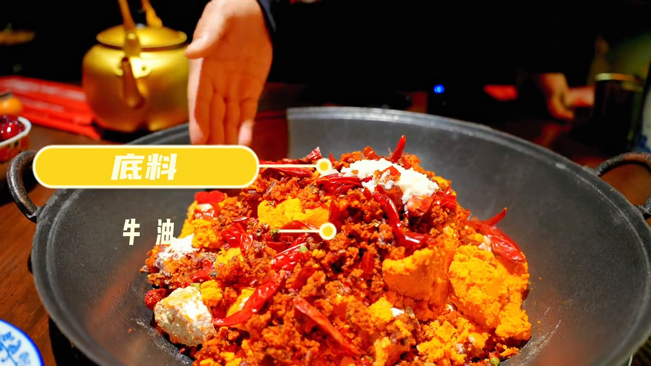 锅底上来了,全红锅底,料牛油、醪糟、老鹰茶打上锅底。这个锅底看着太实在了,我目测得有4斤料。点的特色菜都上来了,一个一个给你们介绍。