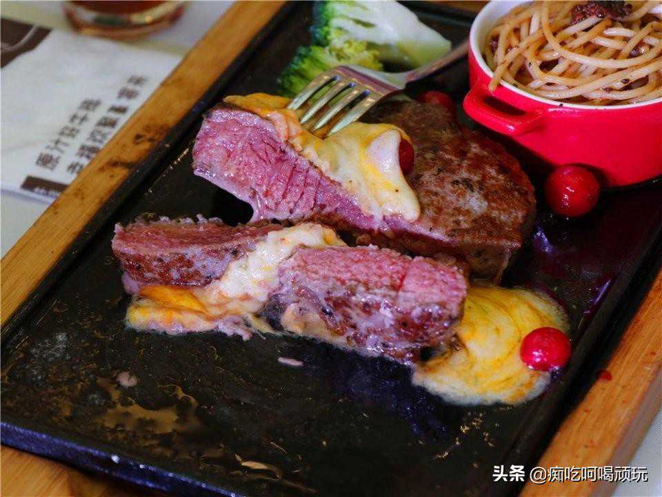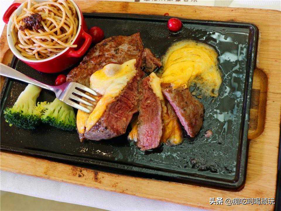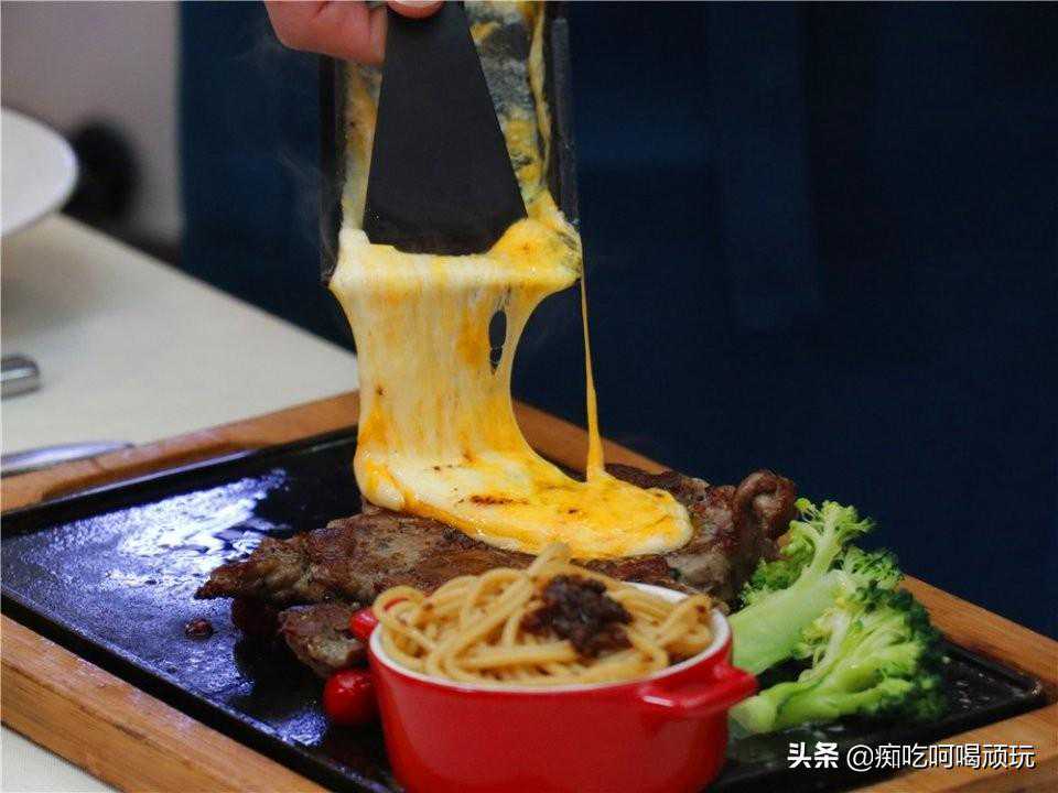 新品瀑布芝士厚切牛排在滋滋冒响的铁板上如约而至,看起来颜值很高,