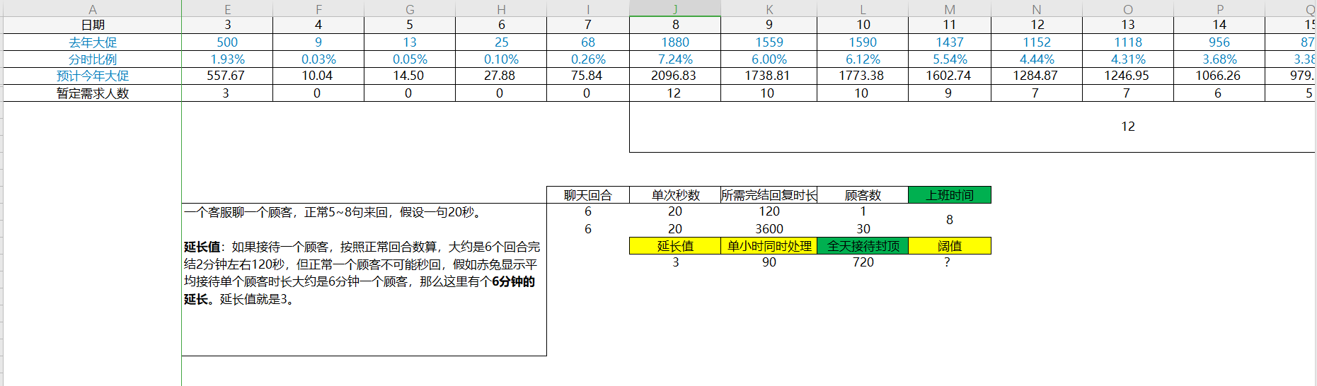 从上图中,可以发现,公式逻辑没问题,但是计算出来的需求客服人数太多,不合理,为了单次活动大量招人是不现实的。