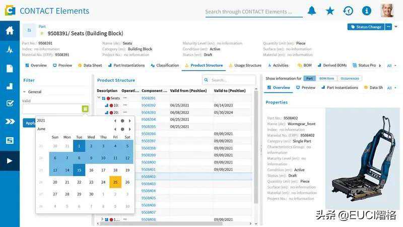 如果未来必须更换产品结构中的某个部件,例如由于新的DIN标准或使用其他组件需求,产品开发现在可以提前计划生产。为此,用户可以单独定义何时或何时发布的文档和零件有效。新的有效期在指定日期自动生效,并替换零件清单中到目前为止有效的零件。借助新的过滤功能,还可以根据其有效性快速轻松地找到文档和零件。