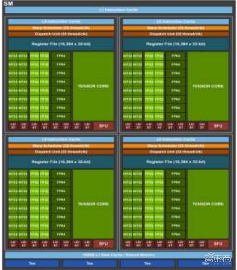 除了上述运算单元外,GPU的微架构还包含L0/L1操作缓存、Warp调度器、分配单元(DispatchUnit)、寄存器堆(registerfile)、特殊功能单元(Specialfunctionunit,SFU)、存取单元、显卡互联单元(NVLink)、PCIe总线接口、L2缓存、二代高位宽显存(HBM2)等接口。