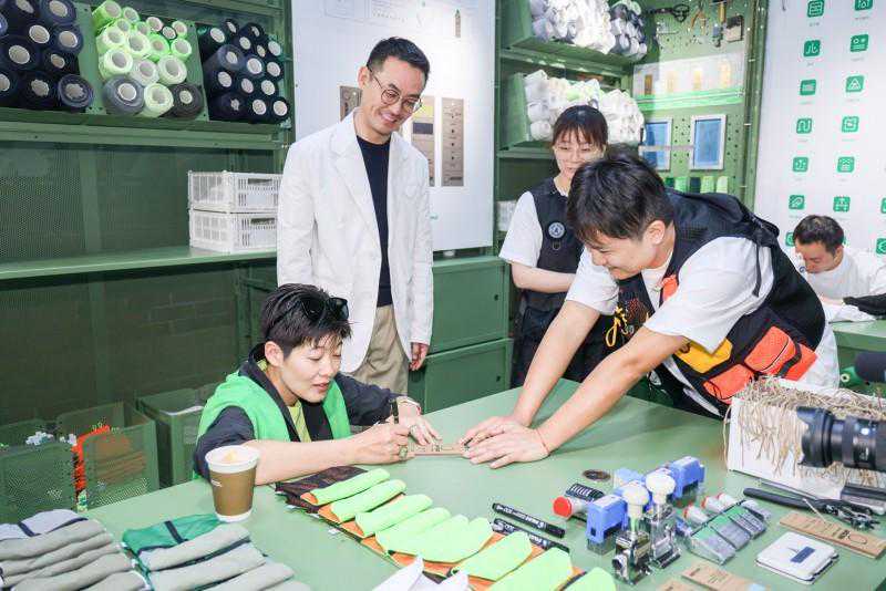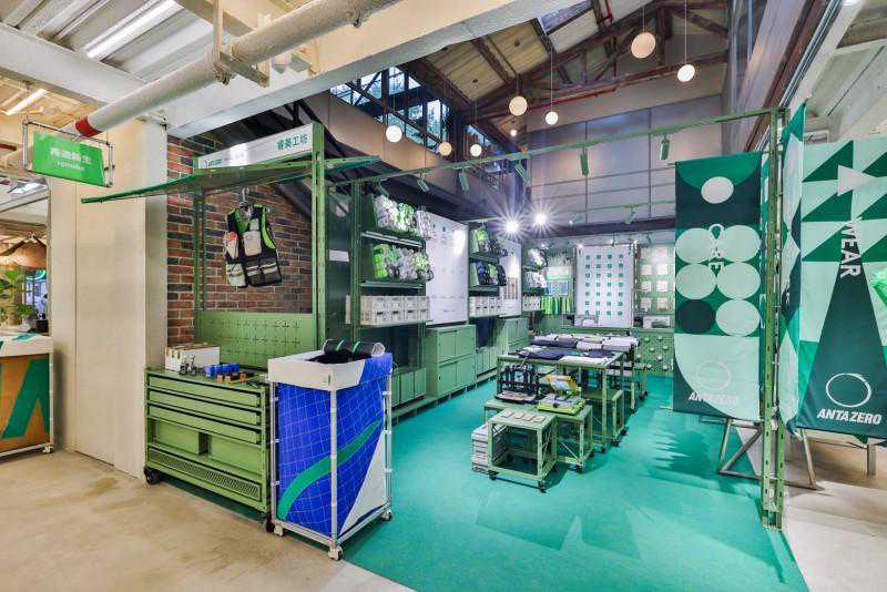 不同于常规店铺,这家占地面积450平方米的多元空间融合创意展陈、零售、社区服务以及互动体验——消费者在店内不仅可体验及购买使用环保材料的产品,还能观赏可持续概念的艺术装置、阅读可持续相关书籍、甚至可以参与产品再造工坊体验等。本次项目特别邀请可持续时尚领域专家崔丹作为安踏可持续项目顾问,带领其团队“canU可持续时尚”策划并把控店铺的落成。来自建筑、时尚、艺术等多个领域的创造者,采用“再造”为核心手法,将安踏废弃面料、生产边角料与废弃包装、残次产品再利用为店内的产品陈列器架、家居等,使他们兼具使用功能与美学价值。