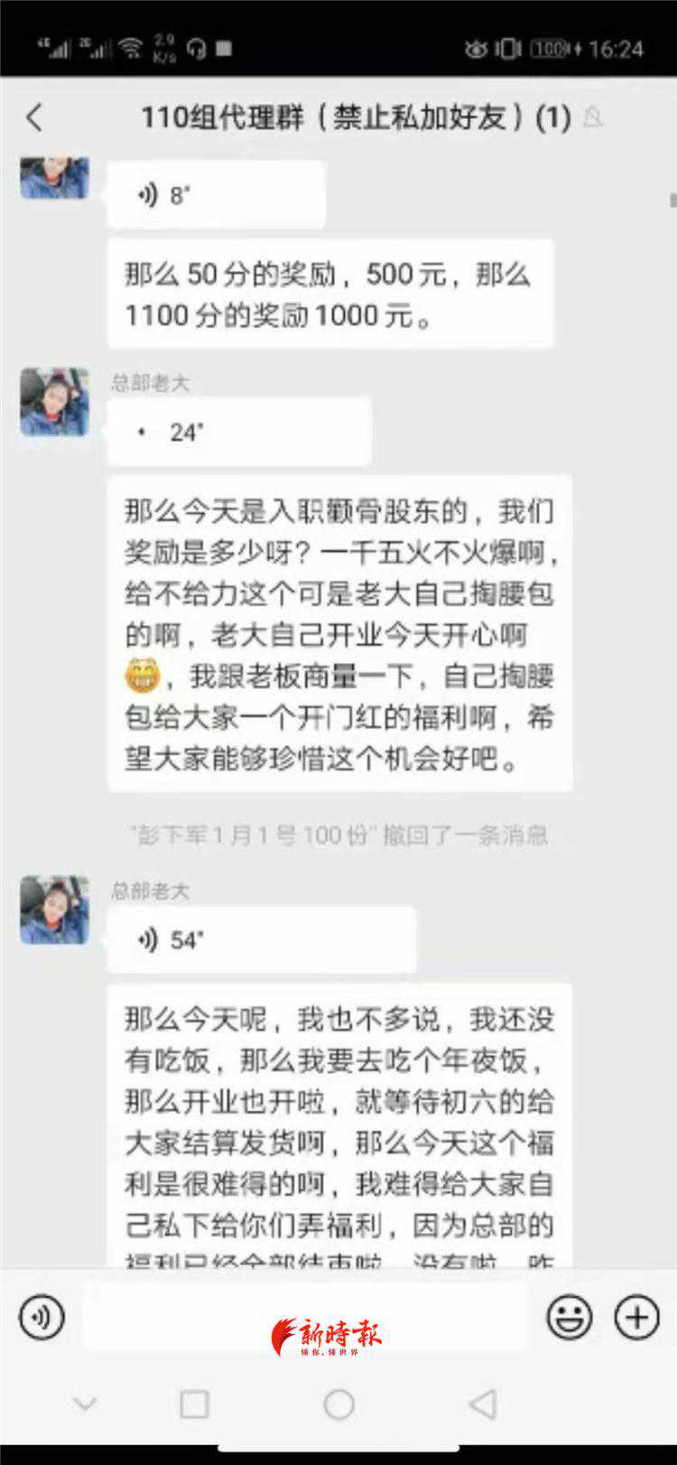 变故发生在正月初五晚。凌晨三点左右,阿妮等7000余代理被从群内踢出,代理群随之解散。“当天早上看手机的时候,我亲戚提醒我说公司跑路了,很多亲戚都是代理。”阿妮说,据他们统计,自己和亲朋好友被骗数额两百余万元。而大家入职的钱,也大多都是通过刷信用卡和网上借贷所得。
