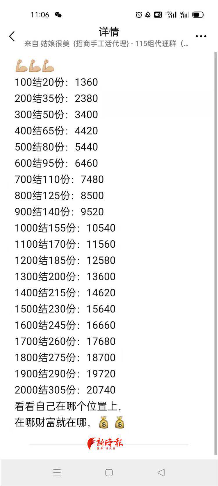 为了让群内代理们入职,自称“星耀工艺公司”董事长的吴邱萍在工作群内发布了入职后的详细结算明细:入职10份,可将99幅钻石画放在加工厂,每6天结算一次费用。10份的入职费为5790元,每幅分红68元,6天结款5幅,总分红为340元,一个月的分红就是1700元;20份的入职费为11580元,每六天分红是680元,每个月的分红为3400元。以此类推,只要入满100份,交入职费57900元,每天便能结算分红1360元。