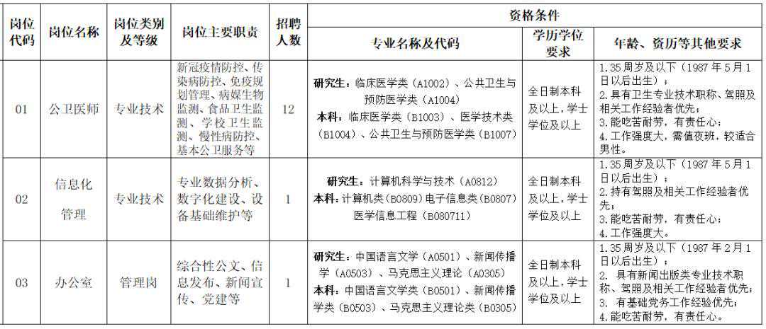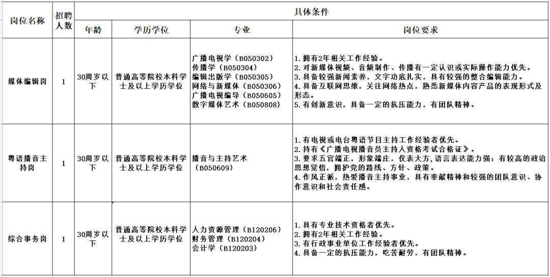 具有中华人民共和国国籍,拥护中华人民共和国宪法;遵纪守法,具备良好的品行和职业道德,无在案或其他社会治安问题;具有正常履行职责的身体条件和工作能力;详见《招聘岗位表》。